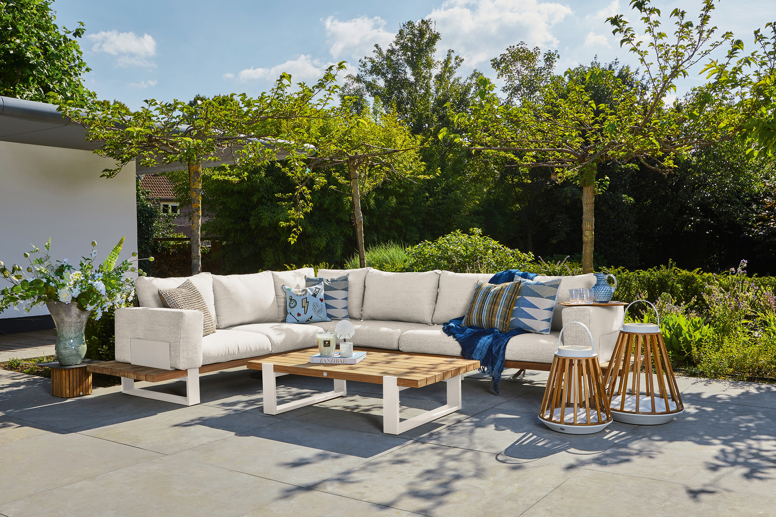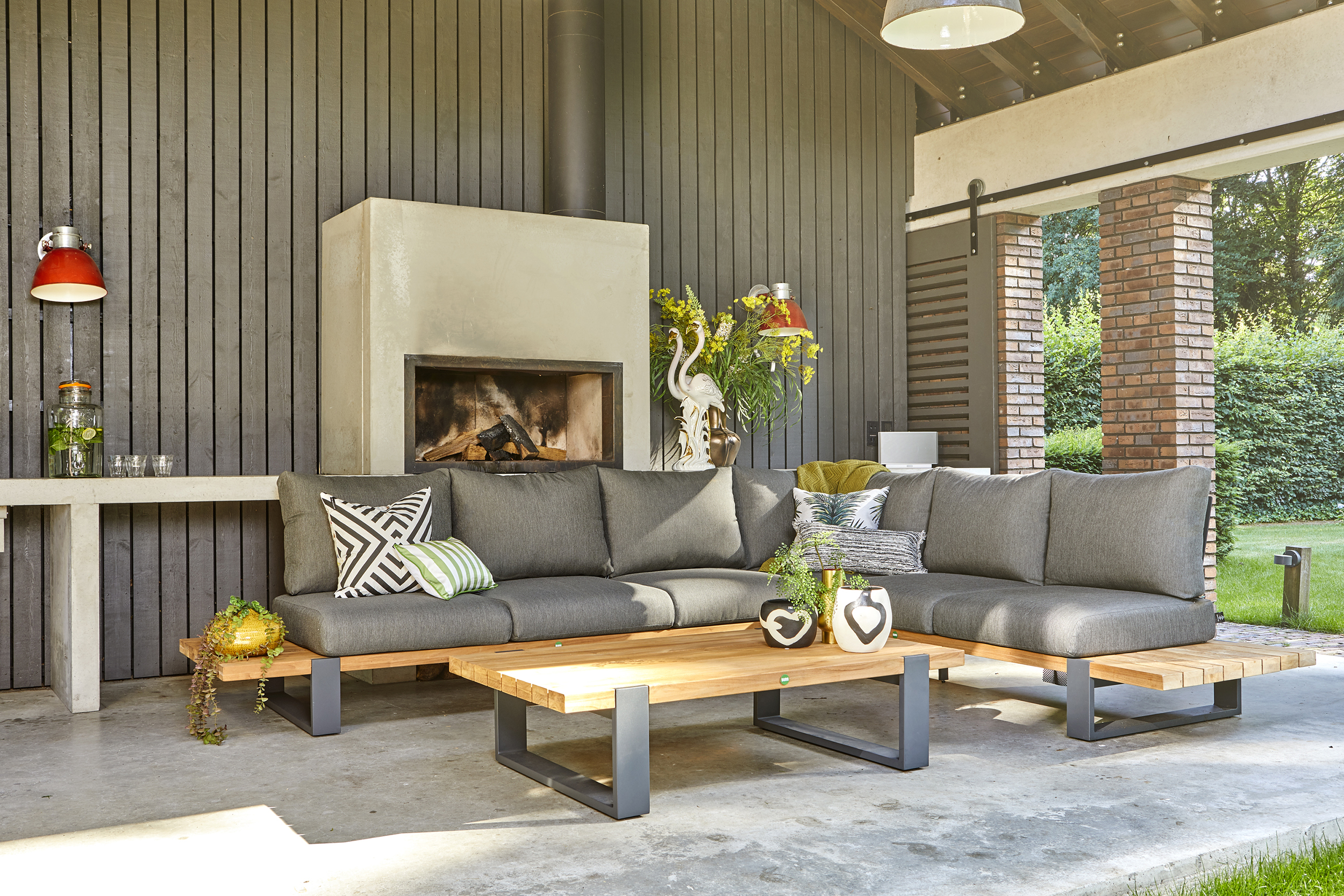 Dank der Verwendung hochwertiger Materialien kann dieses Set das ganze Jahr über draußen bleiben. Aluminium ist wetterfest und hat eine robuste Beschichtung für eine besonders lange Lebensdauer. Teak ist eine starke Holzart, die häufig für Gartenmöbel verwendet wird. Mit der Zeit verändert sich die Farbe in ein warmes Grau. Dies ist Teil des natürlichen Prozesses und für viele eine attraktive Eigenschaft des Materials. Die Kissen sind mit einem hochwertigen Outdoor-Stoff bezogen. Dieser strapazierfähige Stoff ist wasserabweisend und leicht zu reinigen.