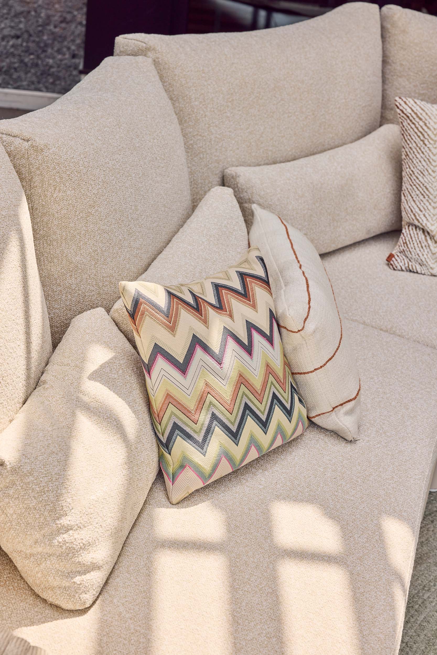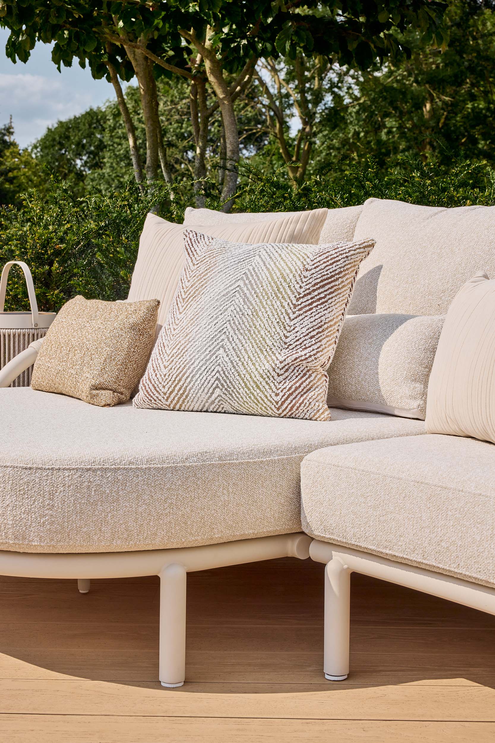 Lounge set Feroli stands on an aluminum frame with round tubes and soft shapes. SUNS uses industrial aluminum which brings extra stability and a powder coating for extra longevity. The cushions and scatter cushions are in the color Beachy bouclé, a slightly fluffy fabric.