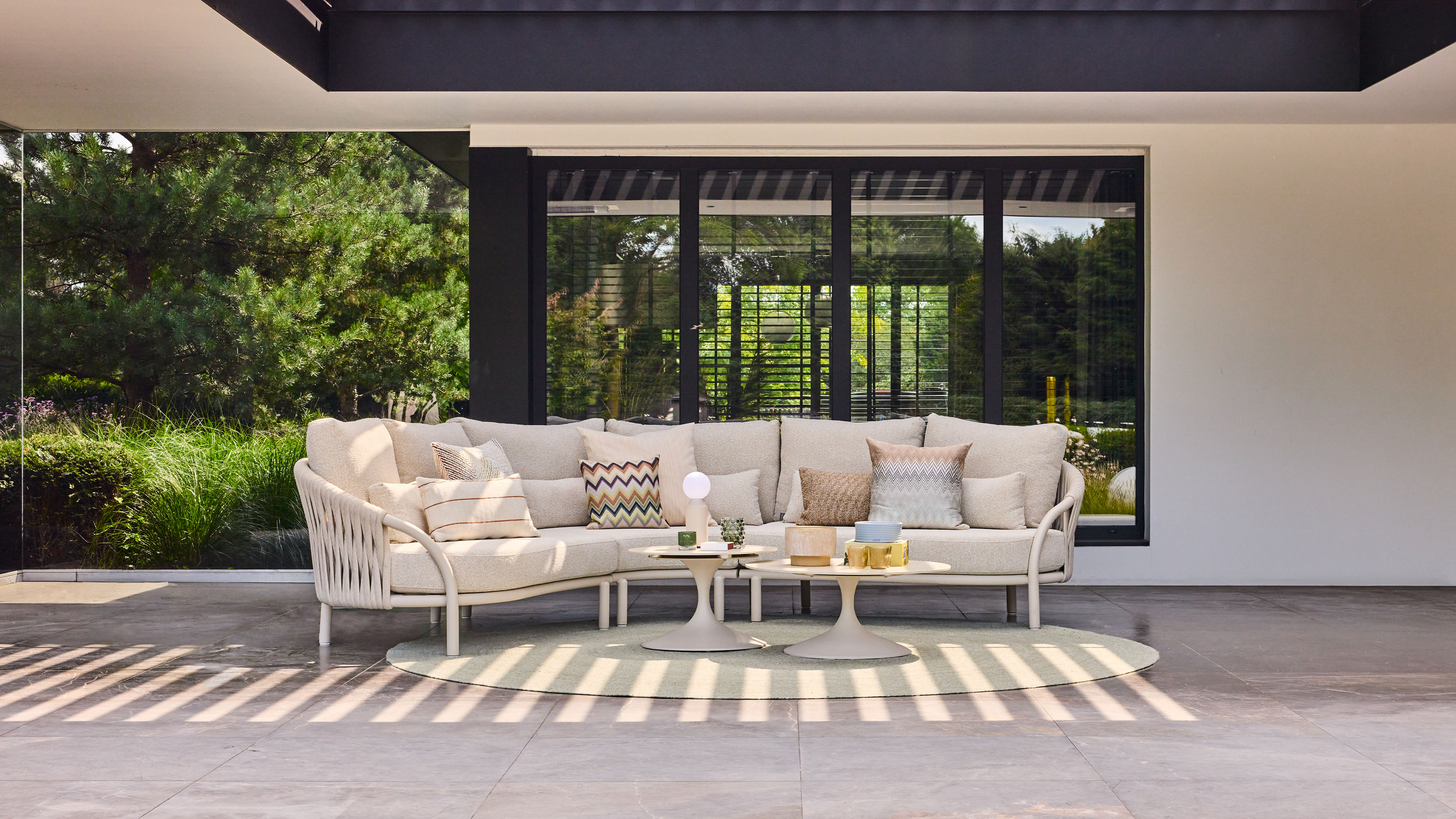 The design stands out for its full, handcrafted look. The thick ropework around the seats adds warmth and texture, creating an enveloping seating feel. The slim aluminum frame keeps the set airy and elegant without sacrificing sturdiness.