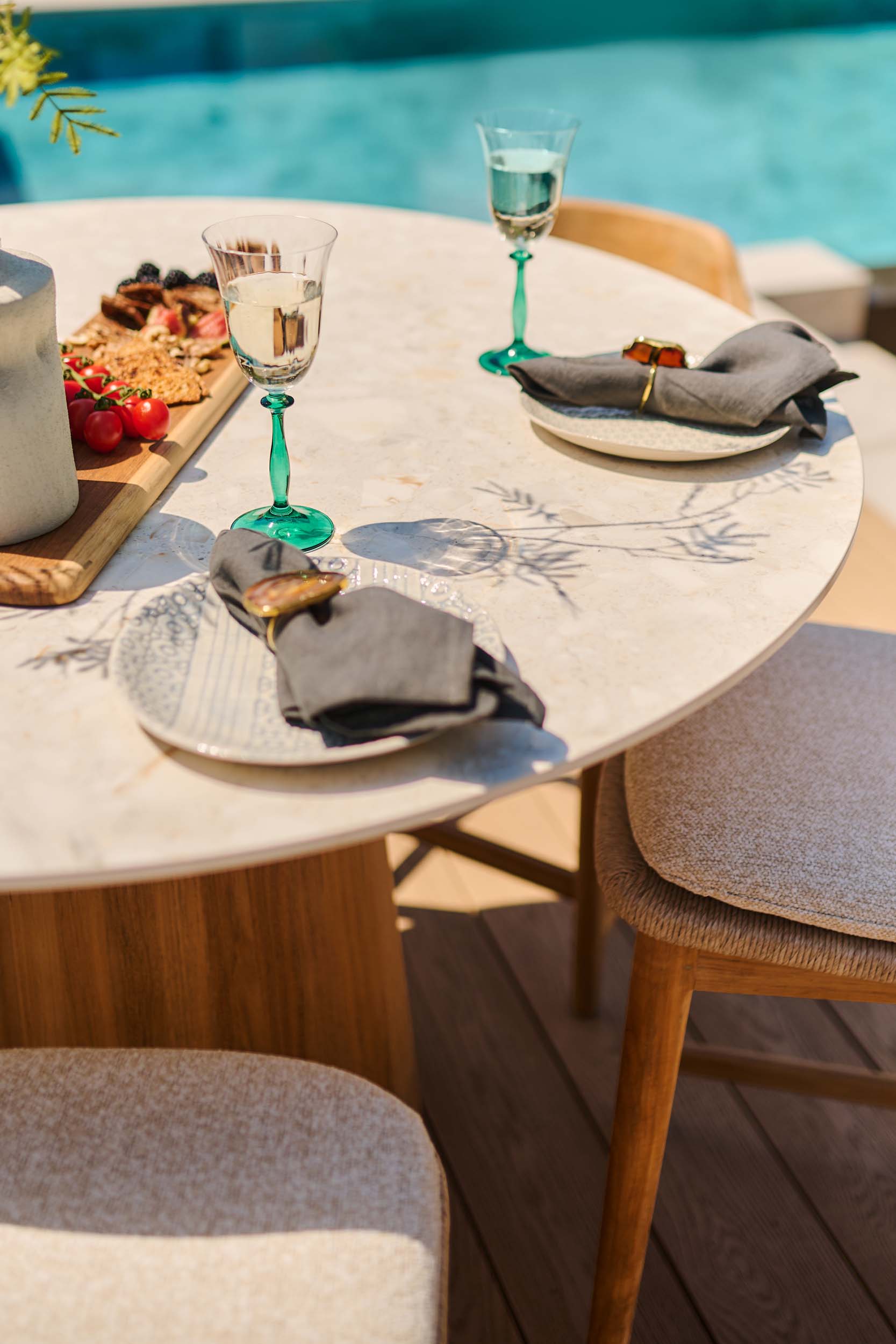 For the table top, choose from full teak or Neolith. Teak exudes pure, natural elegance. Neolith, made from 100 percent natural raw materials via a sintering process, is hard, scratch-resistant and resistant to heat, cold and UV radiation.