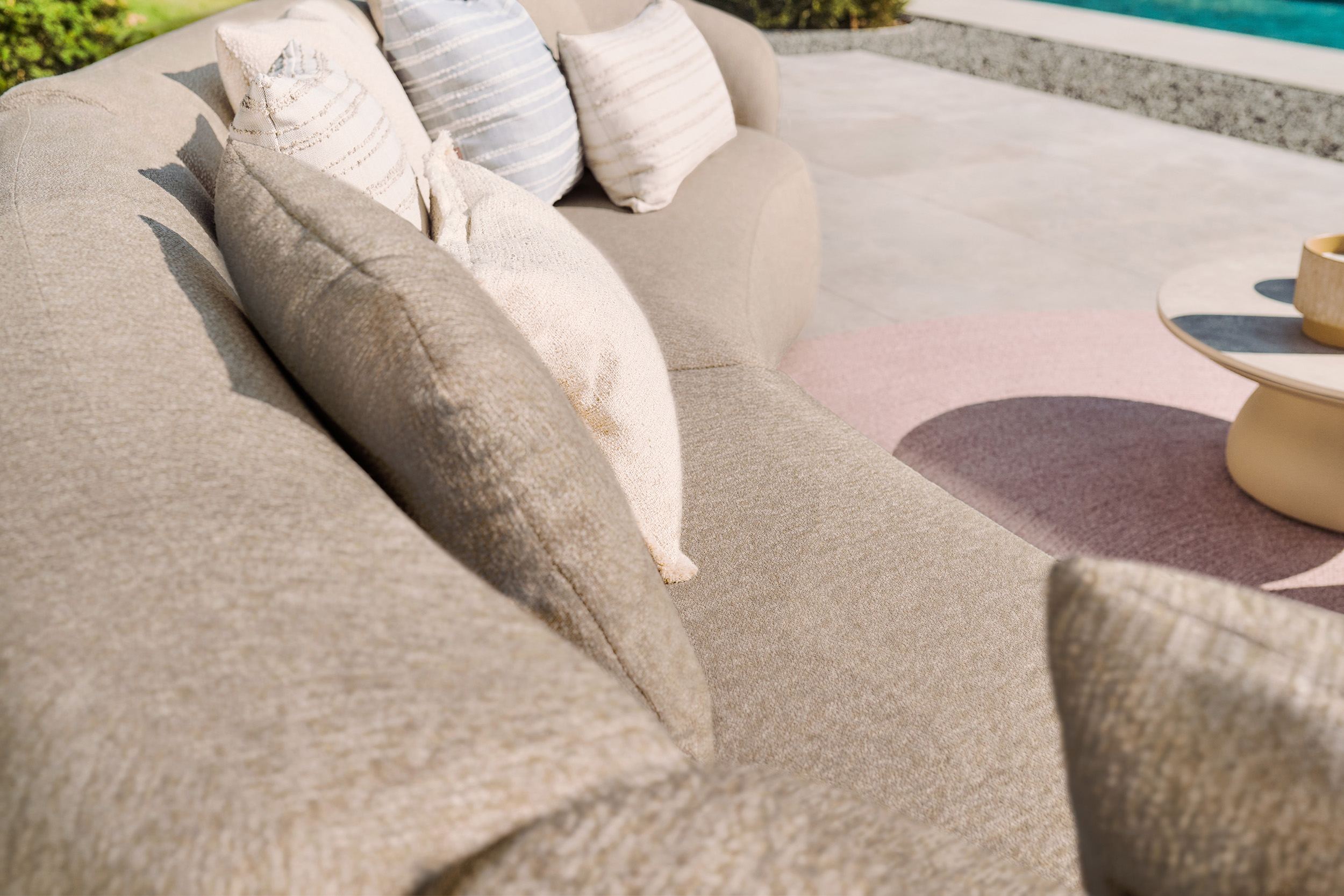Thanks to the high-quality Quick Dry Foam core and coating on the inside of the cushion fabric, the lounge set has excellent weather and water resistance. Venosa is available in Pebble desert bouclé and Seashell bouclé colorways.