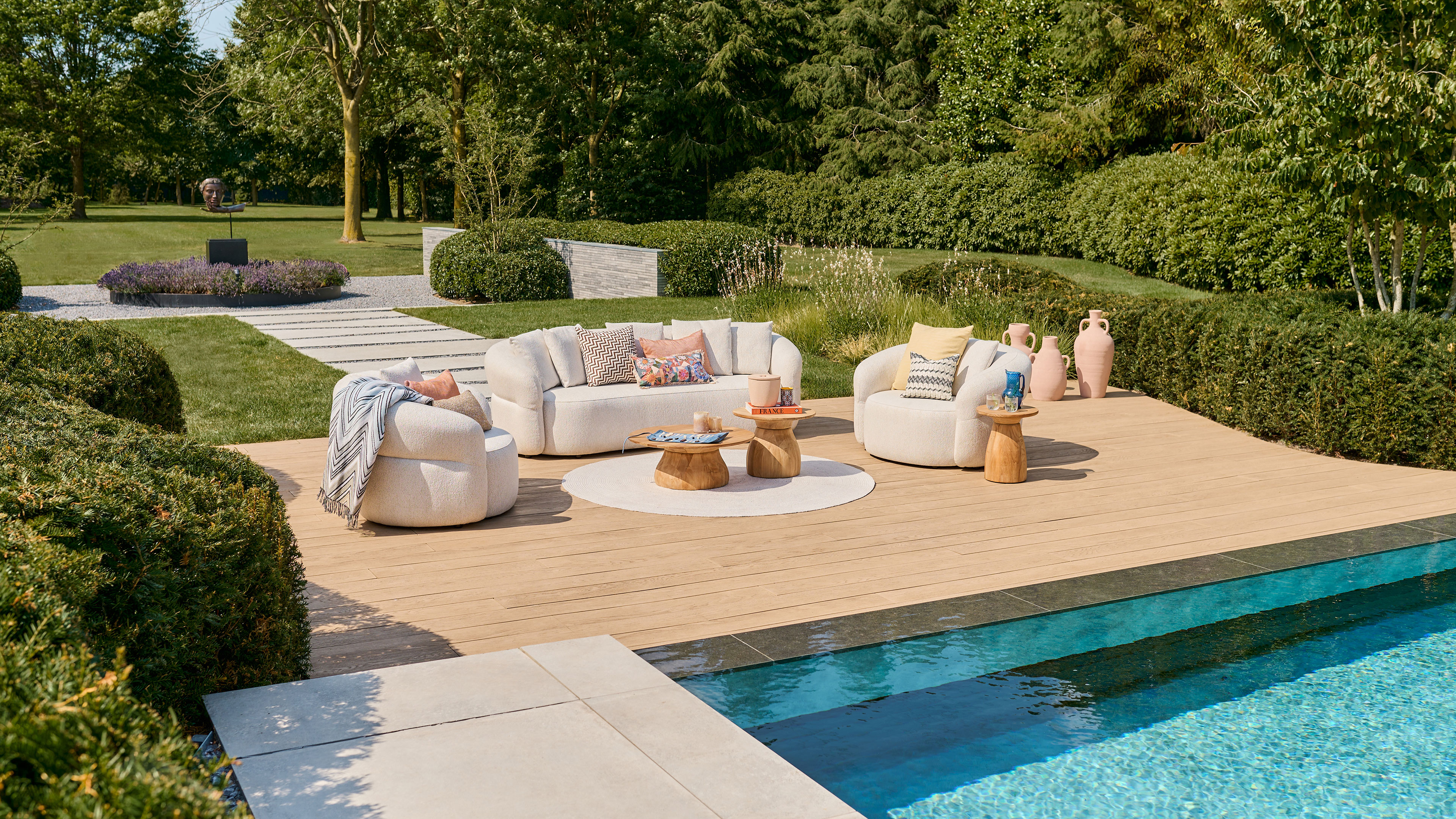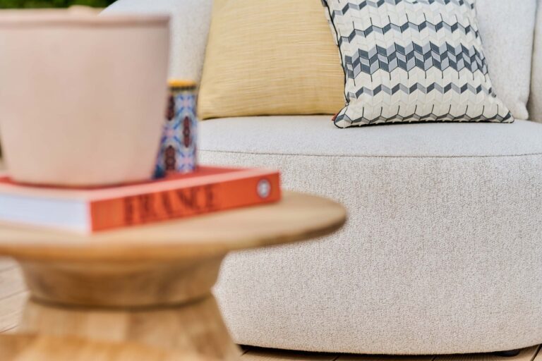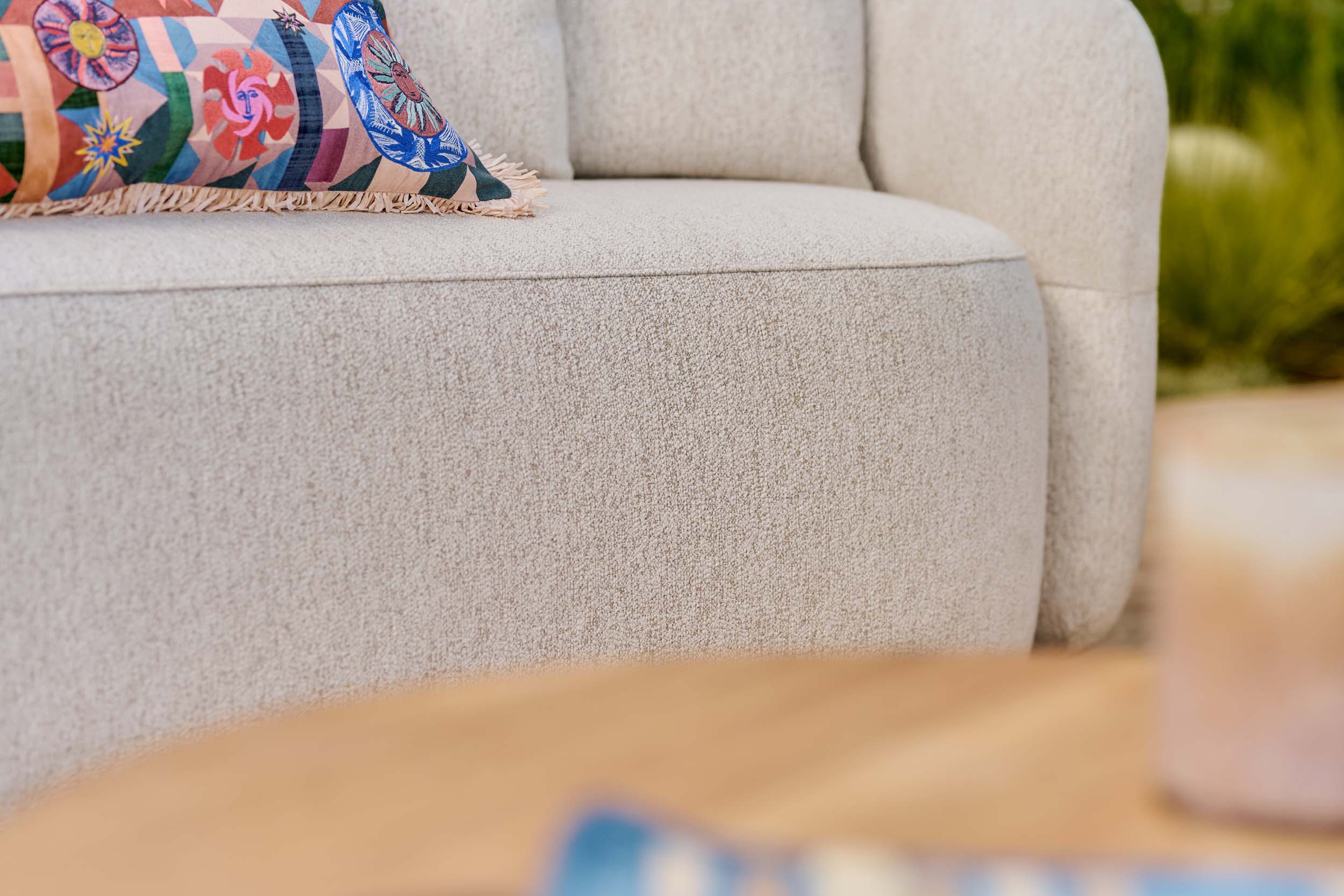 SUNS Venosa is excellent weather and water resistant thanks to its high-quality Quick Dry Foam core and coating on the inside of the fabric. The sofa set is available in Pebble desert bouclé and Seashell bouclé colorways.