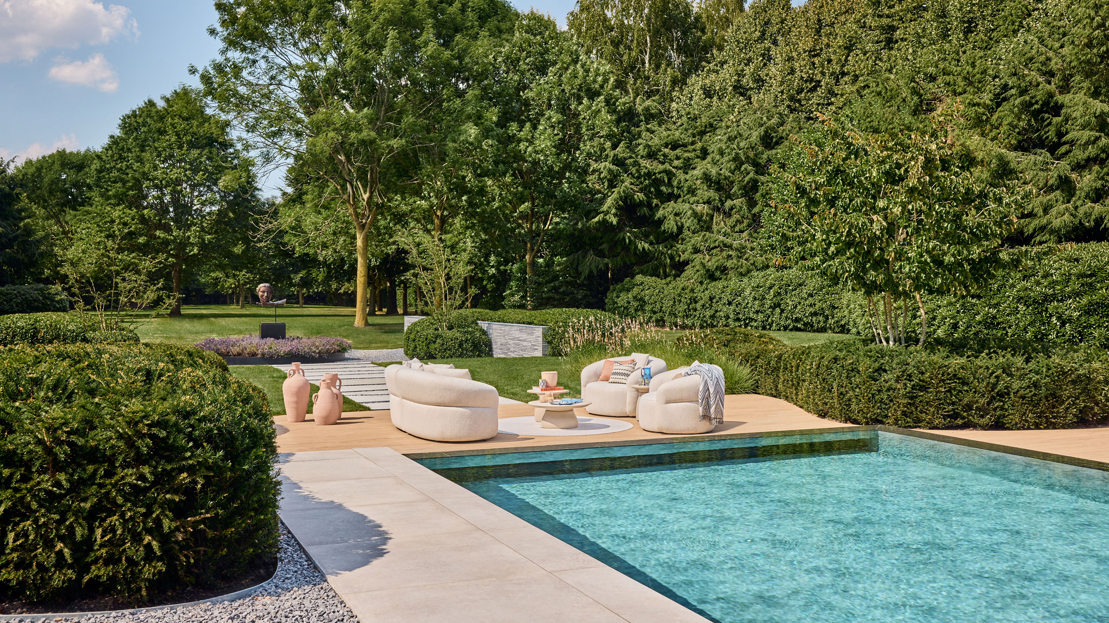 Like the lounge set, Venosa is fully upholstered. Fabric plays the leading role here, and you can feel it. The soft bouclé fabric follows the organic shapes and gives each element a refined, almost cuddly feel. The sofa set looks generous and elegant without being heavy.