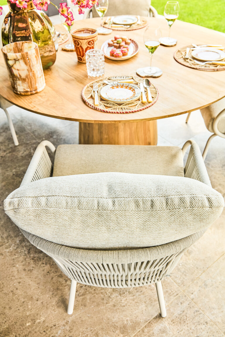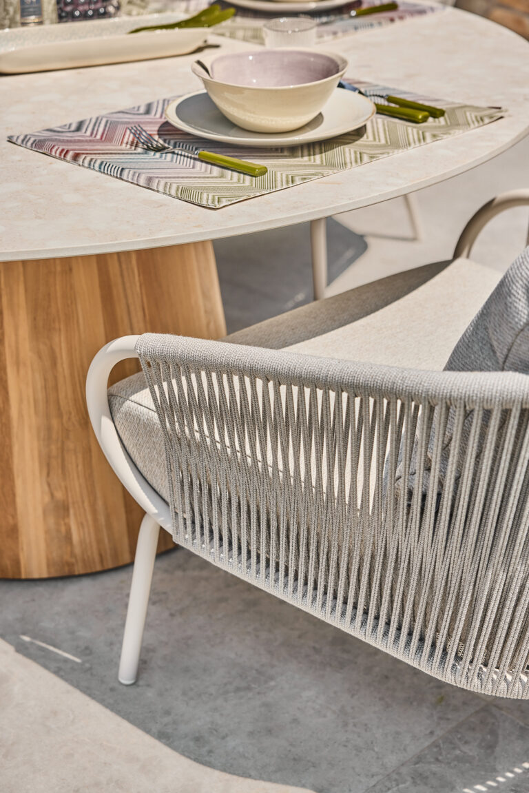 Met de rondgevormde Sorolo creëer je gemakkelijk een gezellige sfeer. Met het teak of Neolith® tafelblad een eigentijdse uitstraling.