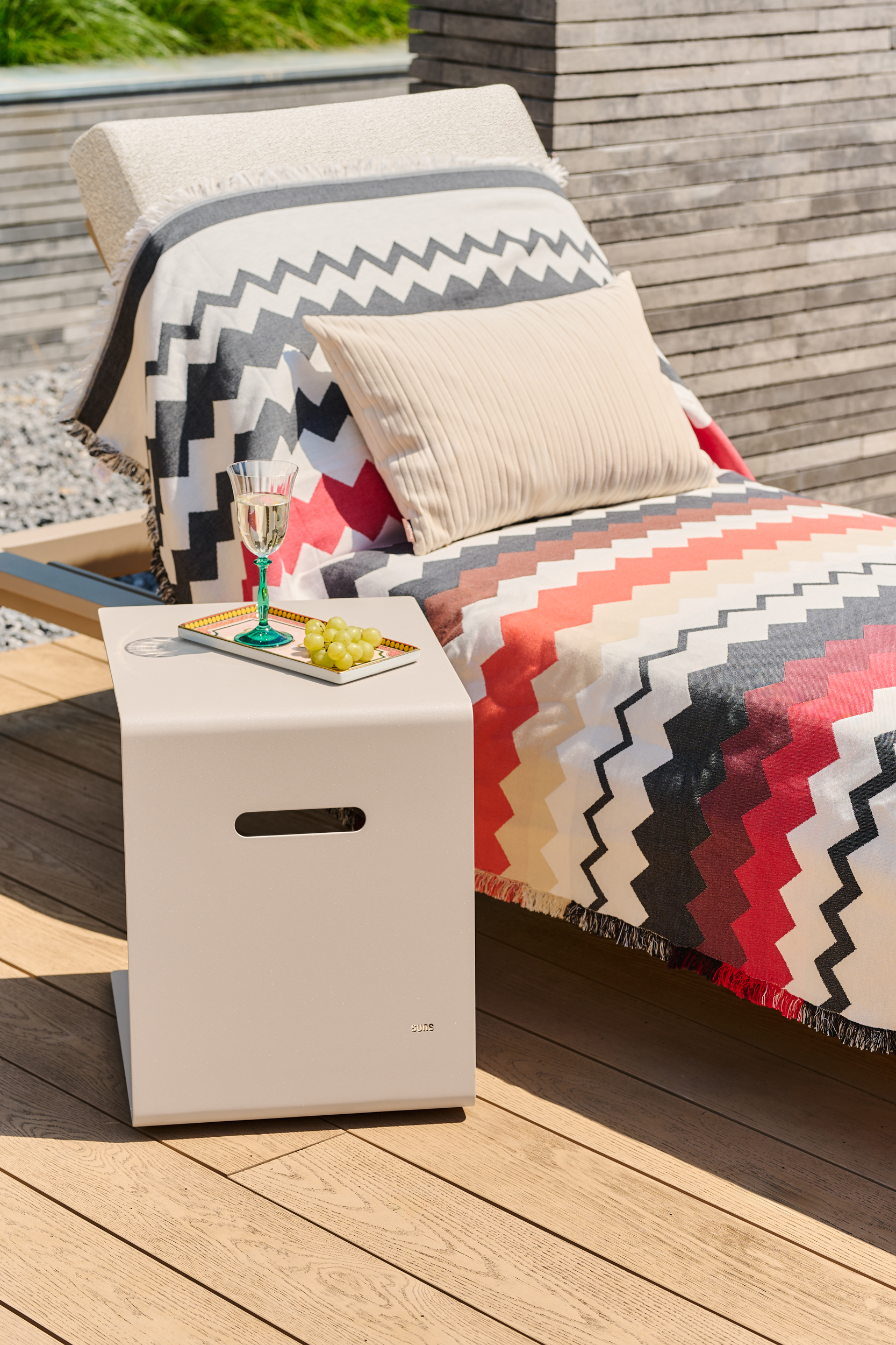 The Basta Lounger combines a slim silhouette with thoughtful ease of use. Thanks to the adjustable back section, you can effortlessly find your ideal lying position. From sunbathing to daydreaming with a good book. The seat is finished in textilene, a strong and breathable material that molds to the body and provides extra comfort even without a cushion. Convenient wheels on the back make moving easy: follow the sun or create a new arrangement in an instant. The comfortable cushion is filled with Quick Dry Foam® and covered with our premium bouclé outer fabrics. Soft in texture, weather resistant and dry again in no time after a rain.