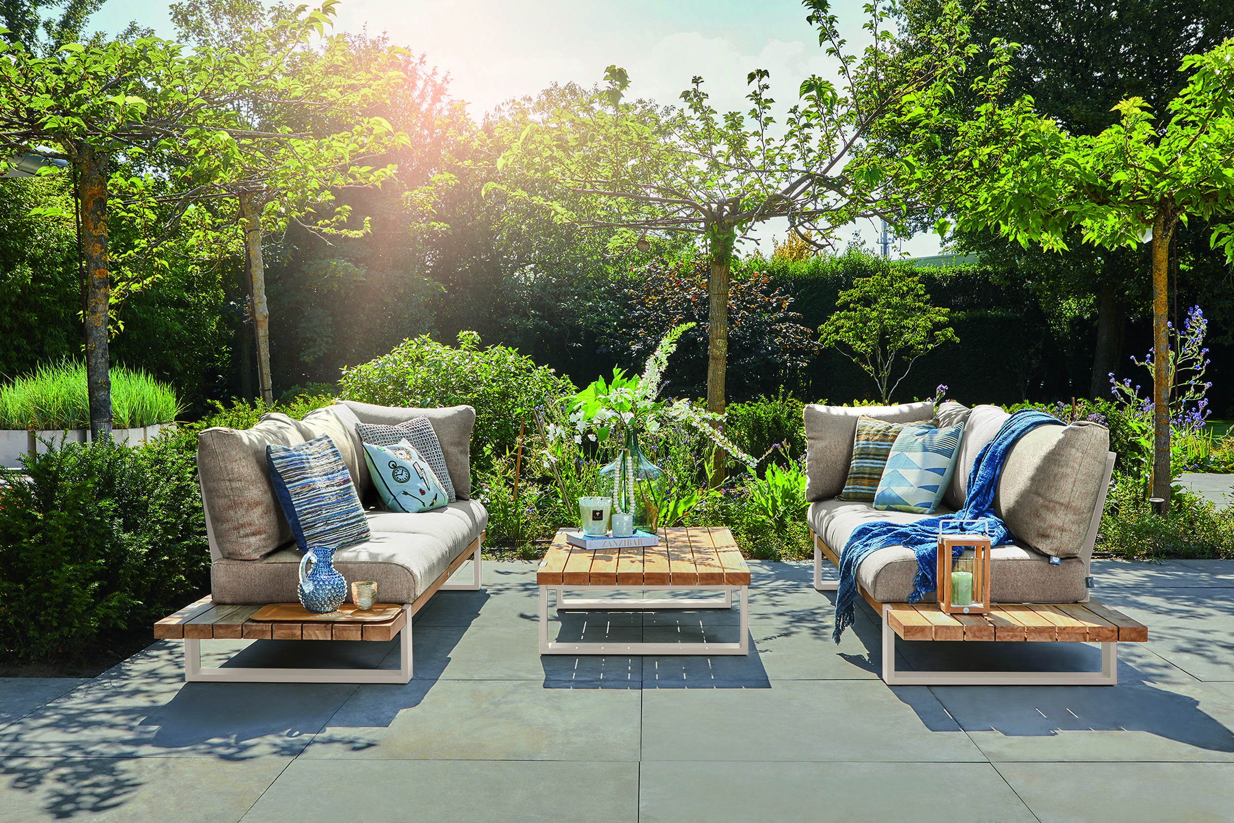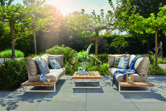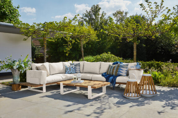 Nardo is a stylish lounge set in coated aluminum and robust teak. Teak forms the sturdy and weather-resistant base of this set. Aluminum legs provide the sturdy looks and solid construction. The backrests are also made of aluminum and coated in the same color as the frame. Nardo features our innovative cushion fixation. Thanks to the loop on the cushions and the wooden rod, annoying slipping of the cushions is a thing of the past. For extra comfort and a different look, you can optionally add armrests to the lounge set.