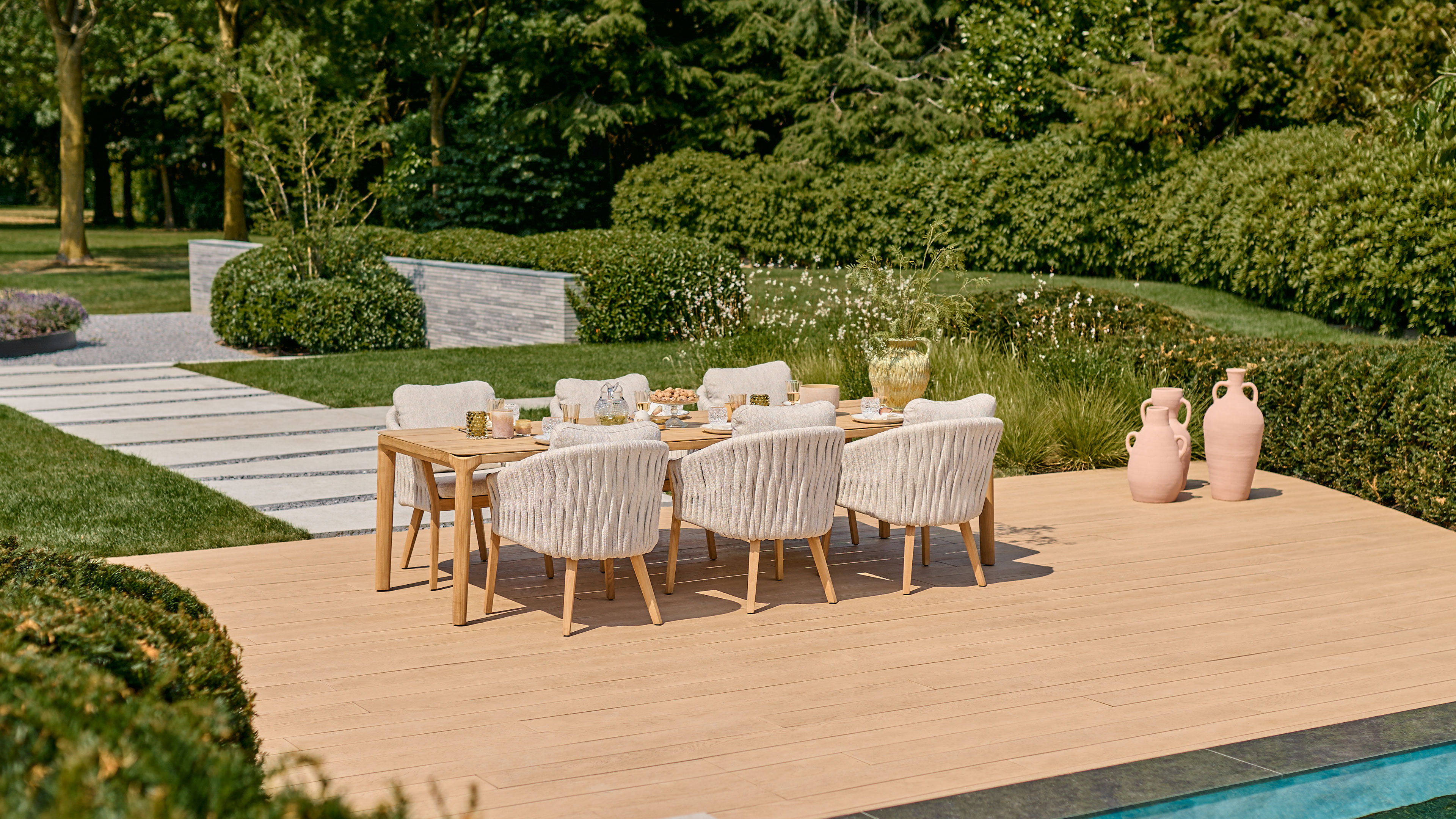 Teak is known for its strength, durability and weather resistance. SUNS uses only certified teak from controlled plantations, including in Indonesia. This wood develops a warm, gray hue and retains its natural beauty. By combining craftsmanship with innovative techniques, we create high-quality garden furniture that is both stylish and durable.