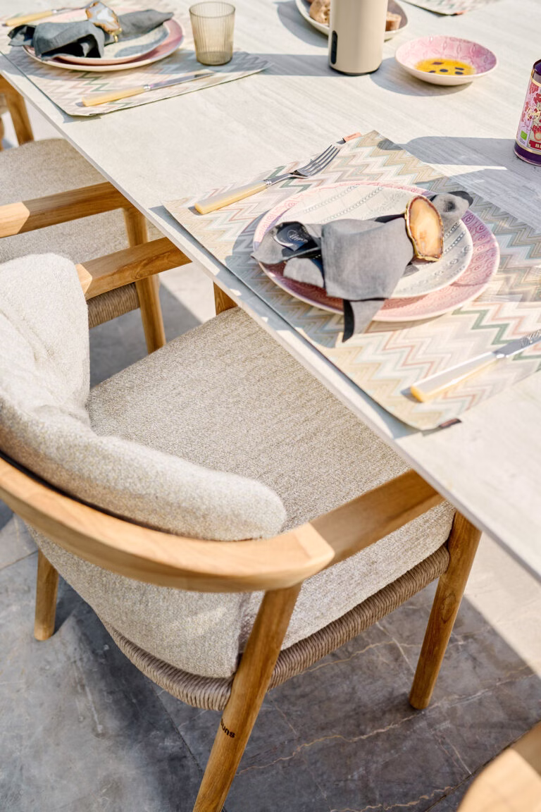 Pemba is available with a fully solid teak top or with a tabletop in Neolith®. Both versions share the same refined design language and recognizable teardrop-shaped leg construction, a subtle detail that you notice especially when you get closer.